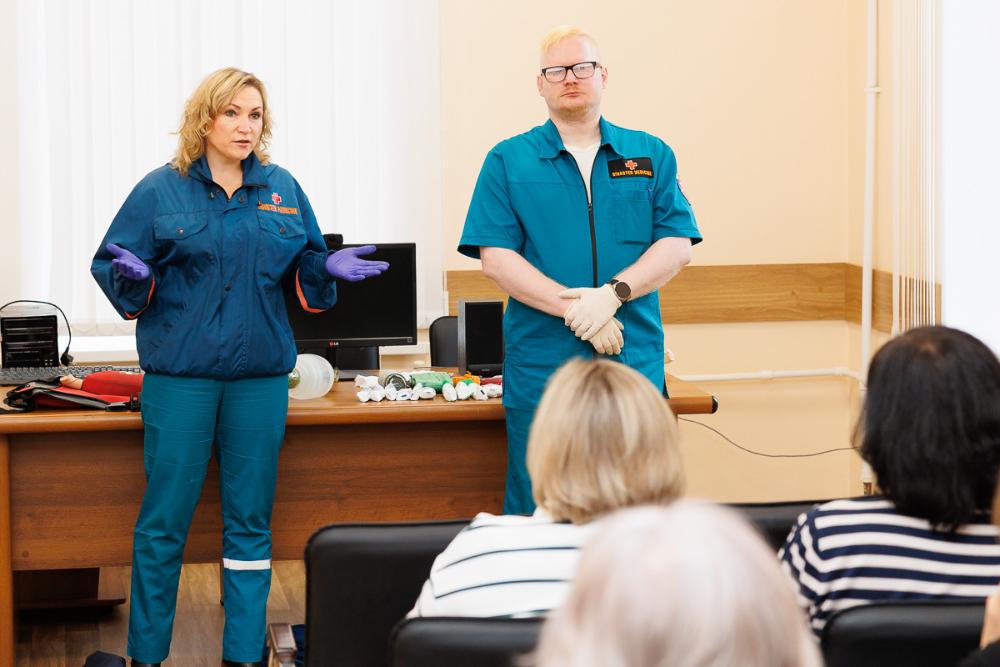 Заведующая учебным центром Вихляева Инна Николаевна и преподаватель центра Утешев Сергей Владимирович рассказали работникам территориального фонда о том, что такое первая помощь, в каких случаях она оказывается и как действовать в ситуациях, когда счёт идёт на минуты.